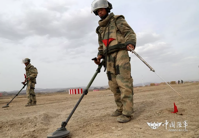 淺灘偵察,接到指令后,裝甲運(yùn)輸車快速沖擊至淺灘障礙前,工兵班組魚貫而出,排雷手身著20公斤的搜爆服在濁水進(jìn)行排雷作業(yè),水柱騰空而起,防坦克地雷被成功起爆。沖出險灘后,一片高密度、多型號的雷場封鎖了裝甲車前進(jìn)的道路,兩名投錨手將半發(fā)雷引爆后,探雷手立即手持探雷器,開始了探雷作業(yè),為了使作業(yè)環(huán)境更加貼近實(shí)戰(zhàn),他們還在雷場中專門增加設(shè)置了鐵絲彈殼等金屬干擾物。