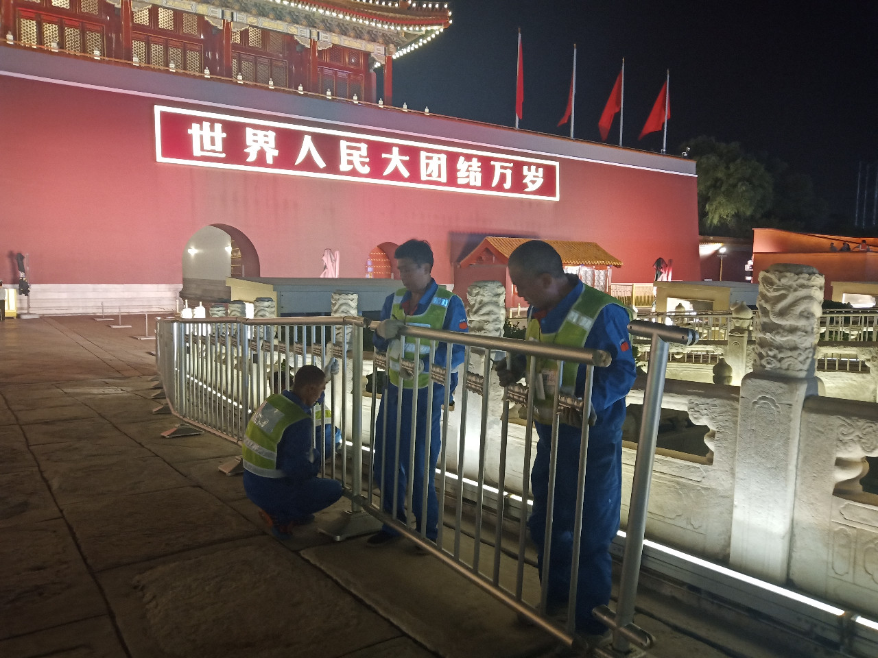 閱兵及群眾慶?;顒?dòng)結(jié)束后,10月2日從凌晨1點(diǎn)開始到6點(diǎn)半結(jié)束,從早上7點(diǎn)半到10點(diǎn)結(jié)束,組織近500人分別完成天安門及廣場(chǎng)周邊地區(qū)、金水橋護(hù)欄全面恢復(fù)。