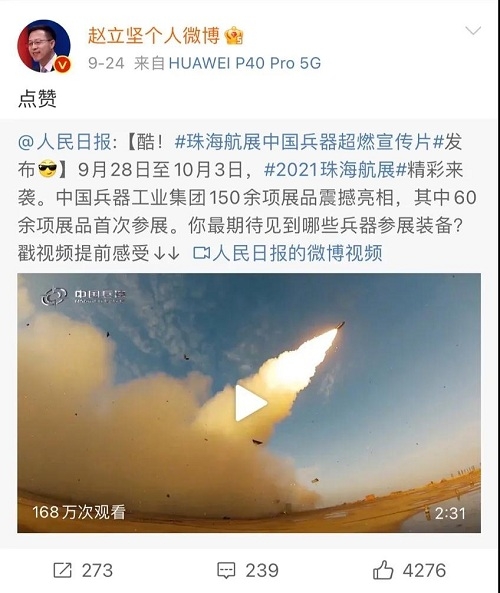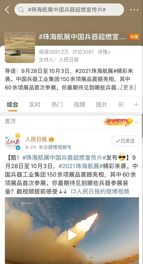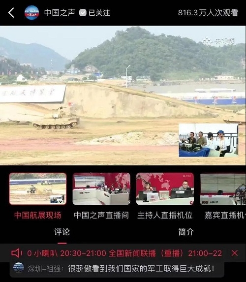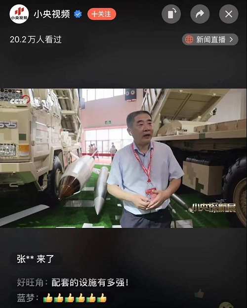 人民日?qǐng)?bào)、新華社、中國(guó)日?qǐng)?bào)、共青團(tuán)中央、國(guó)資小新、騰訊軍事、鳳凰軍事、新浪軍事等新媒體發(fā)布的集團(tuán)公司航展宣傳片等視頻作品燃爆全網(wǎng),閱讀量突破三千萬人次,得到外交部發(fā)言人趙立堅(jiān)轉(zhuǎn)載點(diǎn)贊。集團(tuán)公司微信、微博、抖音號(hào)、微信視頻號(hào)等新媒體宣傳片播放閱讀量超過400萬人次。同時(shí),央視新聞、新華社、中國(guó)之聲、央視軍事、央視新媒體、解放軍報(bào)、共青團(tuán)中央、國(guó)資小新、環(huán)球時(shí)報(bào)等多家媒體對(duì)集團(tuán)公司靜、動(dòng)態(tài)展區(qū)進(jìn)行現(xiàn)場(chǎng)直播,在電視端、客戶端、微信視頻號(hào)、微博、B站、快手、抖音等平臺(tái)受到高度關(guān)注。著名軍事專家杜文龍、央視主持人顧國(guó)寧、央廣中國(guó)之聲主持人王藝等直播兵器館、動(dòng)態(tài)表演區(qū)裝備。