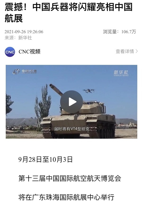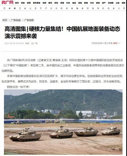 9月28日-10月3日,第十三屆中國(guó)國(guó)際航空航天博覽會(huì)在廣東珠海舉行,中國(guó)兵器工業(yè)集團(tuán)有限公司作為主辦單位閃耀亮相,推出裝甲突擊、火力打擊、智能彈藥、防空反導(dǎo)、無人裝備、非傳統(tǒng)安全、軍工軍技合作等領(lǐng)域新產(chǎn)品及成體系成建制武器系統(tǒng)和解決方案,全方位展示我國(guó)陸軍外貿(mào)武器裝備的最高水平以及雄厚的科技創(chuàng)新、自主研發(fā)與先進(jìn)制造能力,受到廣泛關(guān)注。 央視《新聞聯(lián)播》報(bào)道第十三屆中國(guó)航展,著重介紹了VT4主戰(zhàn)坦克,關(guān)注航展公眾日中國(guó)兵器館情況。9月28日下午央視《新聞直播間》航展特別節(jié)目《藍(lán)天盛會(huì)》邀請(qǐng)集團(tuán)公司訪談嘉賓做客直播間對(duì)中國(guó)兵器館兵器工業(yè)集團(tuán)展區(qū)等進(jìn)行1小時(shí)直播;9月28日下午、10月2日下午分別對(duì)地面裝備動(dòng)態(tài)表演進(jìn)行兩場(chǎng)直播。央視《朝聞天下》、《新聞直播間》、《共同關(guān)注》、《天下財(cái)經(jīng)》、《軍事報(bào)道》、《正午國(guó)防軍事》、《軍武零距離》等相繼推出集團(tuán)公司參展裝備的報(bào)道。