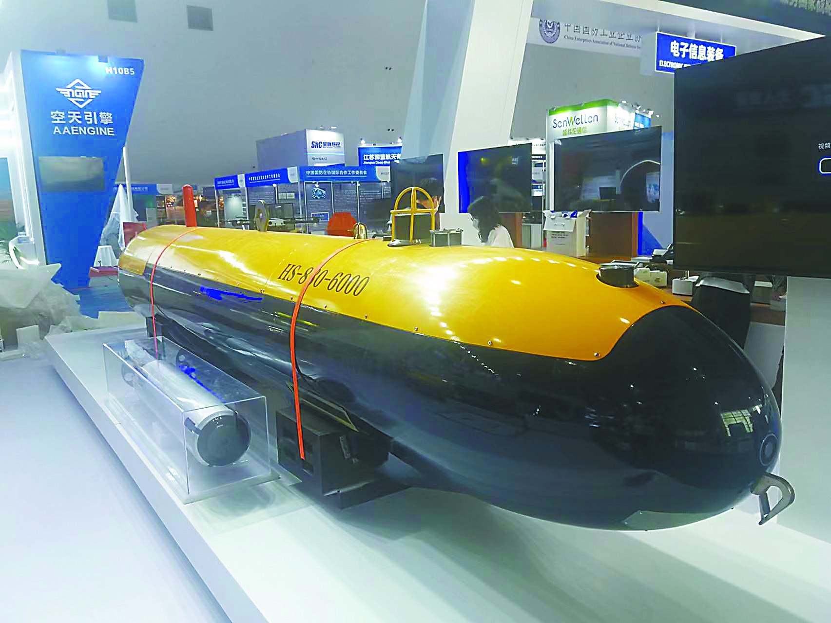 相比公眾相對(duì)熟悉的無人機(jī)和無人車,無人船和無人潛航器的知名度略低,但本屆珠海航展上展出的相關(guān)裝備具備相當(dāng)高的水平。例如HS-880-6000型自主式水下航行器(AUV)就是國(guó)內(nèi)首型搜救型無人潛航器。它的最大工作深度達(dá)6000米,能以3節(jié)的速度連續(xù)航行24小時(shí),配備有深水遇險(xiǎn)目標(biāo)高分辨低照度照明系統(tǒng)、聲信標(biāo)定向引導(dǎo)聲吶、水聲探測(cè)側(cè)掃聲吶等,具備工作水深范圍寬、載荷能力大、續(xù)航力長(zhǎng)、搜尋探測(cè)能力強(qiáng)等特點(diǎn),可對(duì)深海目標(biāo)全自主精細(xì)搜尋、探測(cè)、定位,執(zhí)行深海水下目標(biāo)搜尋探測(cè)和海洋科學(xué)研究任務(wù)。另一款“守望者”無人潛航器個(gè)頭小巧,配備有光學(xué)探頭、戰(zhàn)斗部和通信設(shè)備,可以自動(dòng)靠近水中或海底目標(biāo)進(jìn)行觀測(cè)、毀傷目標(biāo),用于執(zhí)行反水雷、排障、海底管道巡檢等任務(wù)。