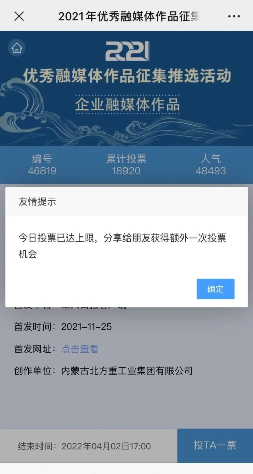 近日,由“文化強(qiáng)國(guó)”光明日?qǐng)?bào)協(xié)同推廣平臺(tái)、光明網(wǎng)、北京師范大學(xué)新媒體傳播研究中心和光明天翼5G融媒實(shí)驗(yàn)室共同主辦的“2021年優(yōu)秀融媒體作品征集推選活動(dòng)”開(kāi)啟線(xiàn)上投票環(huán)節(jié),經(jīng)過(guò)專(zhuān)家委員會(huì)評(píng)審,中國(guó)兵器工業(yè)集團(tuán)北重集團(tuán)《白楊伴我獻(xiàn)國(guó)防》音樂(lè)MV入選活動(dòng)前二十名,并進(jìn)入網(wǎng)絡(luò)投票環(huán)節(jié)。 《白楊伴我獻(xiàn)國(guó)防》 楊樹(shù)參天 高聳云端的是兵工人 “履行好強(qiáng)軍首責(zé)”的壯志凌云! 深植北疆 傾獻(xiàn)沃土的是北重人 “推動(dòng)高質(zhì)量發(fā)展”的壯志豪情! 白楊樹(shù)伴著我們茁壯成長(zhǎng) 見(jiàn)證著我們獻(xiàn)身國(guó)防! 投票方式 1.掃描下方二維碼,進(jìn)入初始界面,點(diǎn)擊“企業(yè)融媒體作品征集”,進(jìn)入投票界面點(diǎn)擊《白楊伴我獻(xiàn)國(guó)防》,點(diǎn)擊“投TA一票”; 2. 每人每日可投10票,直至提示投票達(dá)到上限即可; 3.投票時(shí)間:2022年3月17日09:00-2022年4月2日17:00。 來(lái)源/光明網(wǎng)、北重集團(tuán) |
