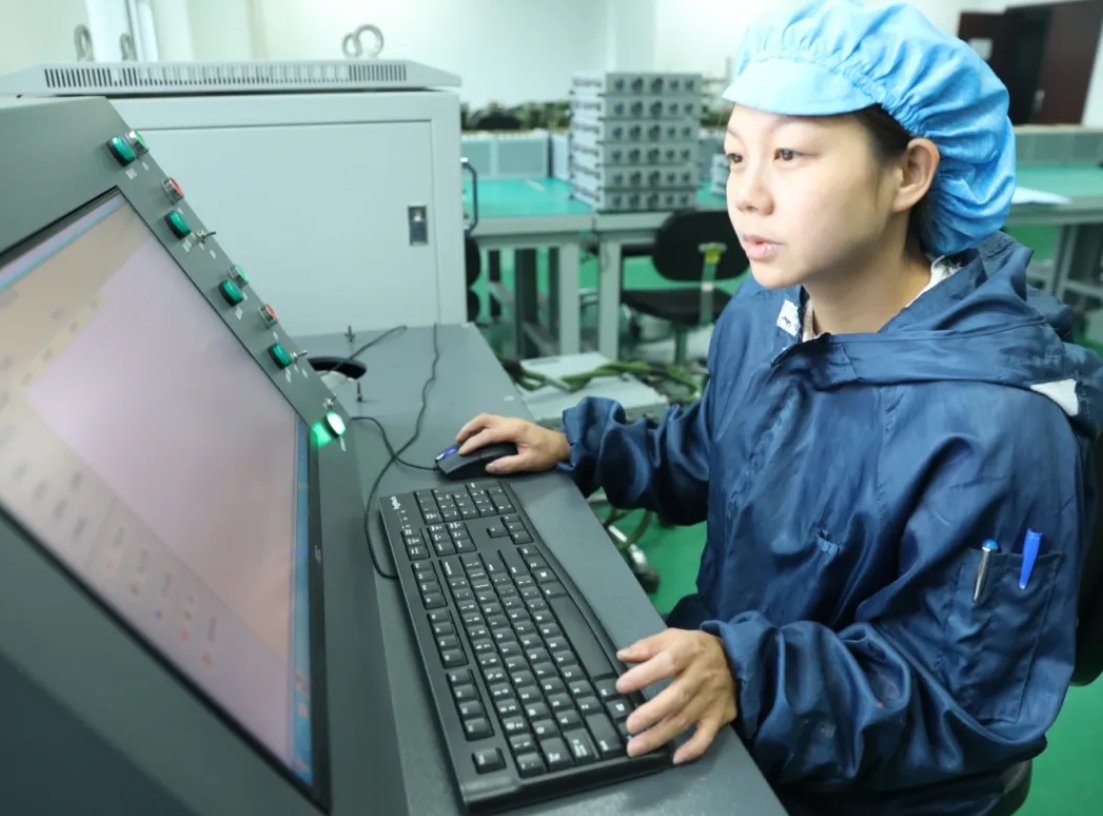 江山重工研究院總裝車間電裝線上,檢驗(yàn)人員正在認(rèn)真地操作線纜檢測(cè)儀,對(duì)某箱體內(nèi)部線纜通斷及絕緣阻值進(jìn)行檢測(cè),排查線纜質(zhì)量隱患。