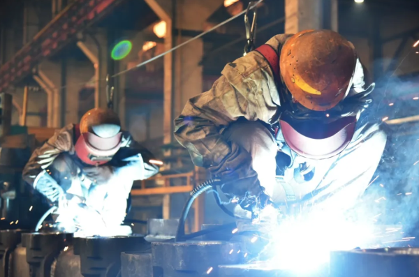 一機(jī)集團(tuán)裝焊車間生產(chǎn)一線,職工手握焊槍和焊帽在車體頂部進(jìn)行高處焊接作業(yè),確保產(chǎn)品如期交付。