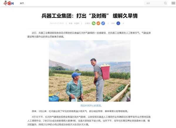 5月27日,中國網(wǎng)刊發(fā)《兵器工業(yè)集團:打出“及時雨” 緩解久旱情》,對中國兵器工業(yè)集團有限公司助力云南省紅河州人工影響天氣、氣象監(jiān)測建設(shè)等方面作出的突出貢獻作了報道。