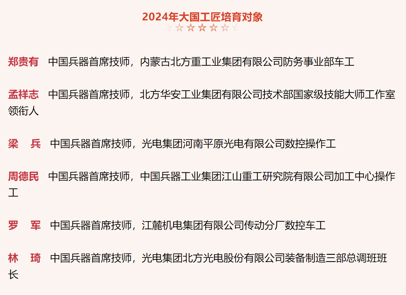 兵器工業(yè)集團(tuán)6名高技能人才入選2024年大國(guó)工匠培育對(duì)象名單 |