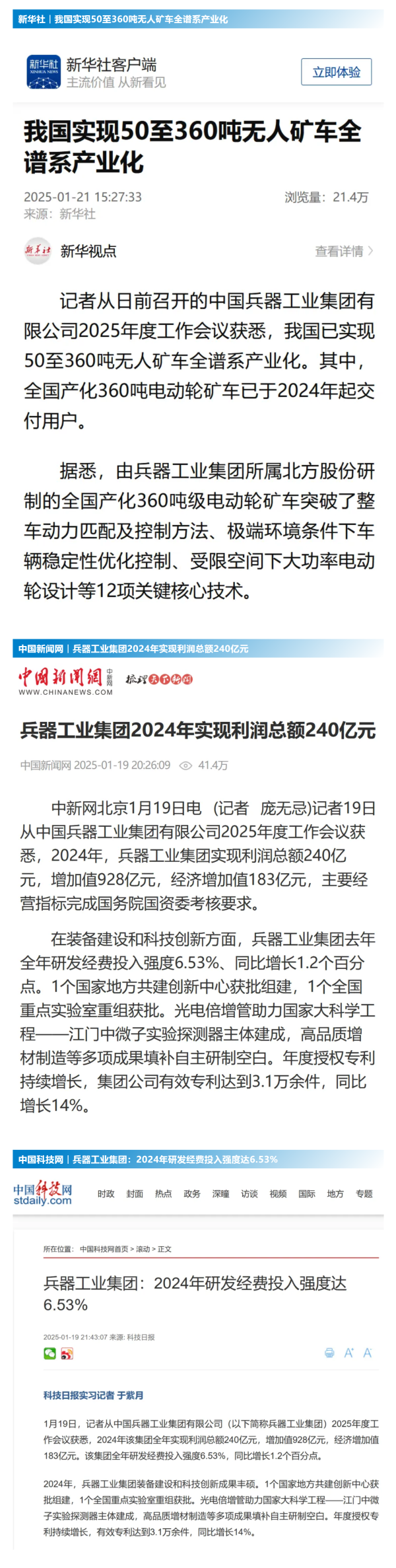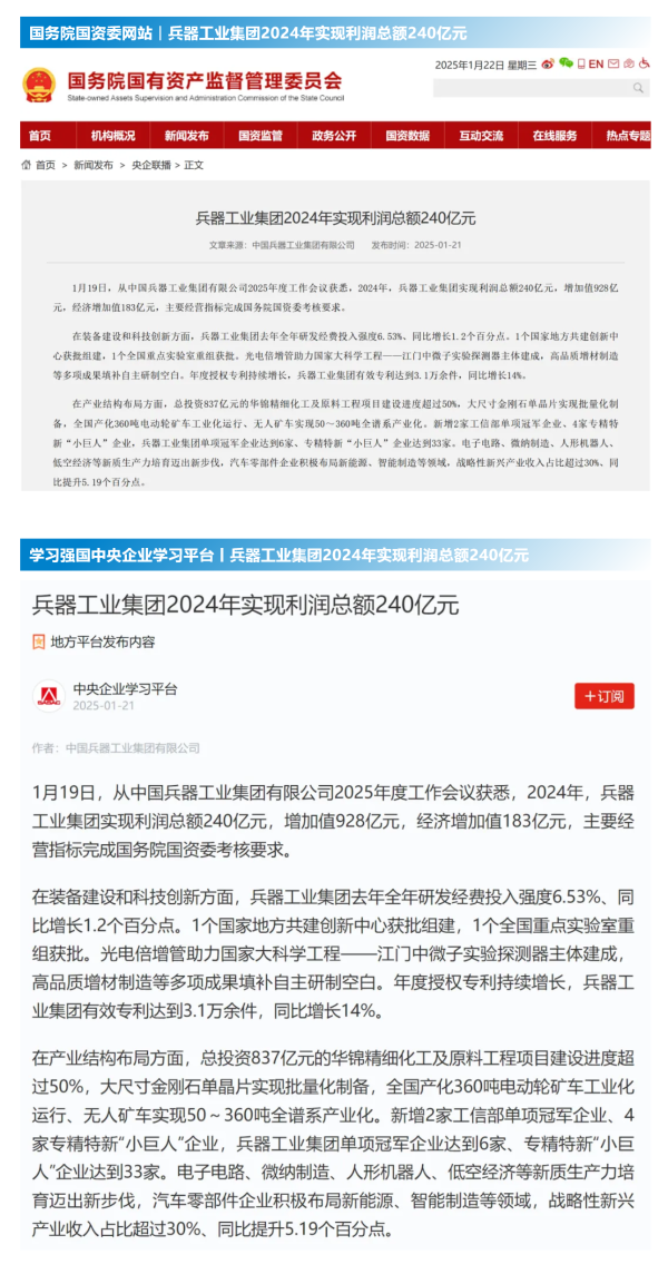1月19日至20日,中國兵器工業(yè)集團有限公司2025年度工作會議在京召開,會議總結(jié)2024年工作,分析形勢任務(wù),明確工作思路,部署2025年工作。 集團公司2024年取得的成績及下一步重點工作受到社會媒體廣泛關(guān)注。新華社、中國新聞網(wǎng)、中國科技網(wǎng)、光明日報客戶端、經(jīng)濟日報客戶端、中國日報網(wǎng)、國務(wù)院國資委網(wǎng)站、學(xué)習(xí)強國中央企業(yè)學(xué)習(xí)平臺、新浪網(wǎng)、網(wǎng)易網(wǎng)、搜狐網(wǎng)、騰訊網(wǎng)、鳳凰網(wǎng)等中央主流媒體、國家部委網(wǎng)站及知名網(wǎng)絡(luò)媒體對集團公司2025年度工作會議進行了報道,重點關(guān)注集團公司經(jīng)營業(yè)績、科技創(chuàng)新、產(chǎn)業(yè)結(jié)構(gòu)布局優(yōu)化等情況。其中,新華社以《我國實現(xiàn)50至360噸無人礦車全譜系產(chǎn)業(yè)化》為題,重點報道了集團公司在推動智能制造水平提升方面取得的成效;中國新聞網(wǎng)、光明日報客戶端、經(jīng)濟日報客戶端、中國日報網(wǎng)等就集團公司2024年度經(jīng)營業(yè)績及各項工作取得的成果進行報道;中國科技網(wǎng)著重報道了集團公司在科技創(chuàng)新和優(yōu)化產(chǎn)業(yè)結(jié)構(gòu)布局方面的最新進展。集團公司門戶網(wǎng)站、微信公眾號、微博等新媒體平臺以及《中國兵工報》也對集團公司工作會議進行了及時報道,各成員單位紛紛對相關(guān)內(nèi)容進行轉(zhuǎn)載,引發(fā)全系統(tǒng)關(guān)注。 集團公司職工及廣大網(wǎng)友熱議工作會 “2025年工作會為我們指明了發(fā)展方向、明確了奮斗目標,面對全新的機遇和挑戰(zhàn),作為兵工人深感責(zé)任重大?!?/p> “科技是第一生產(chǎn)力,一定要以科技創(chuàng)新引領(lǐng)新質(zhì)生產(chǎn)力發(fā)展,為高質(zhì)量發(fā)展提供支撐。” “把各項工作做深、做實、做細,努力為集團公司高質(zhì)量發(fā)展添磚加瓦?!?/p> “2024年中國兵器展示了大國重器,祝新的一年中再創(chuàng)輝煌!” |